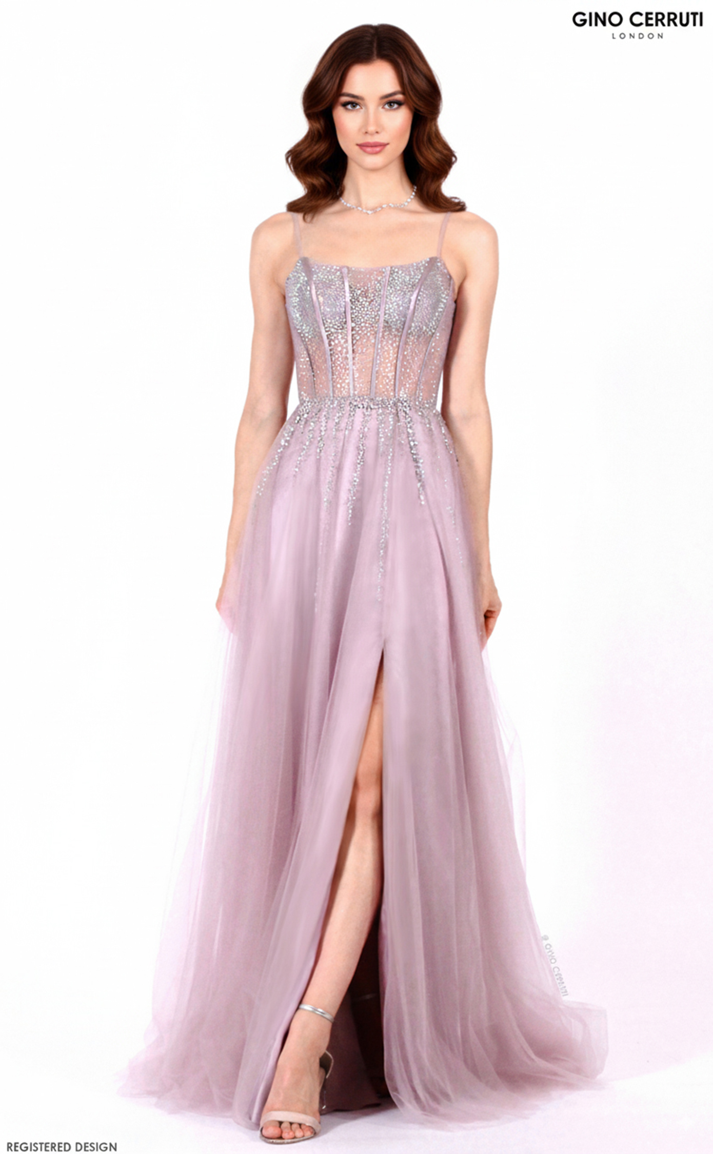 Dazzle in this exquisite gown featuring a beaded corset bodice that beautifully shapes your figure. The embellished waistline adds a touch of sophistication, while the A-line skirt with a leg slit offers both elegance and allure. Finished with a lightweight design and a lace-up back, this dress is perfect for any special occasion! * Beaded corset bodice * Embellished waistline * A-line skirt * Leg slit * Lace up back