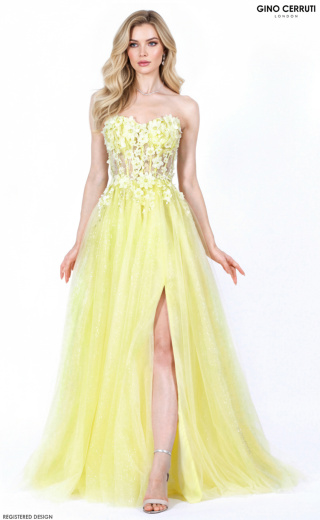 This enchanting gown features a floral corset bodice with detachable matching straps for versatile styling. The lightweight sparkling skirt includes a daring leg slit and is complemented by a small train for added elegance. Finished with a zip back and unique lace-up detail, this dress is perfect for any special occasion! * Floral corset bodice * Detachable matching straps * Lightweight sparkling skirt * Small train * Zip up back