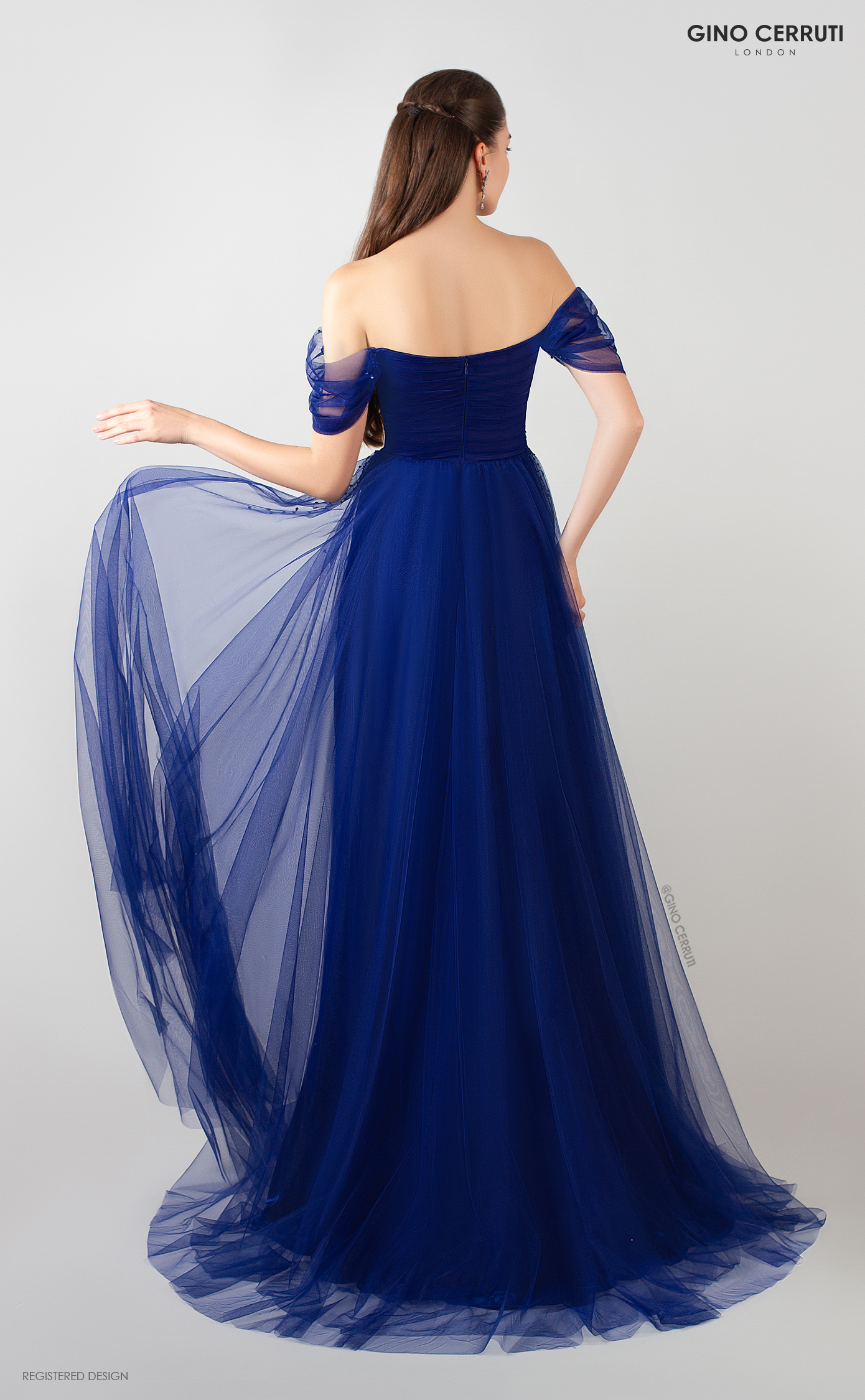 Every girl's dream! This dress is straight out of a princess fairy tale, featuring a fluffy skirt with a leg slit and open shoulders. The beadwork emphasizes the waist, creating a stunning silhouette. Watch how beautiful it looks when you spin on the dance floor—it's truly spectacular! * Off-shoulder * Ruched straps and bust * Beaded waistline * A-line skirt * Leg split
