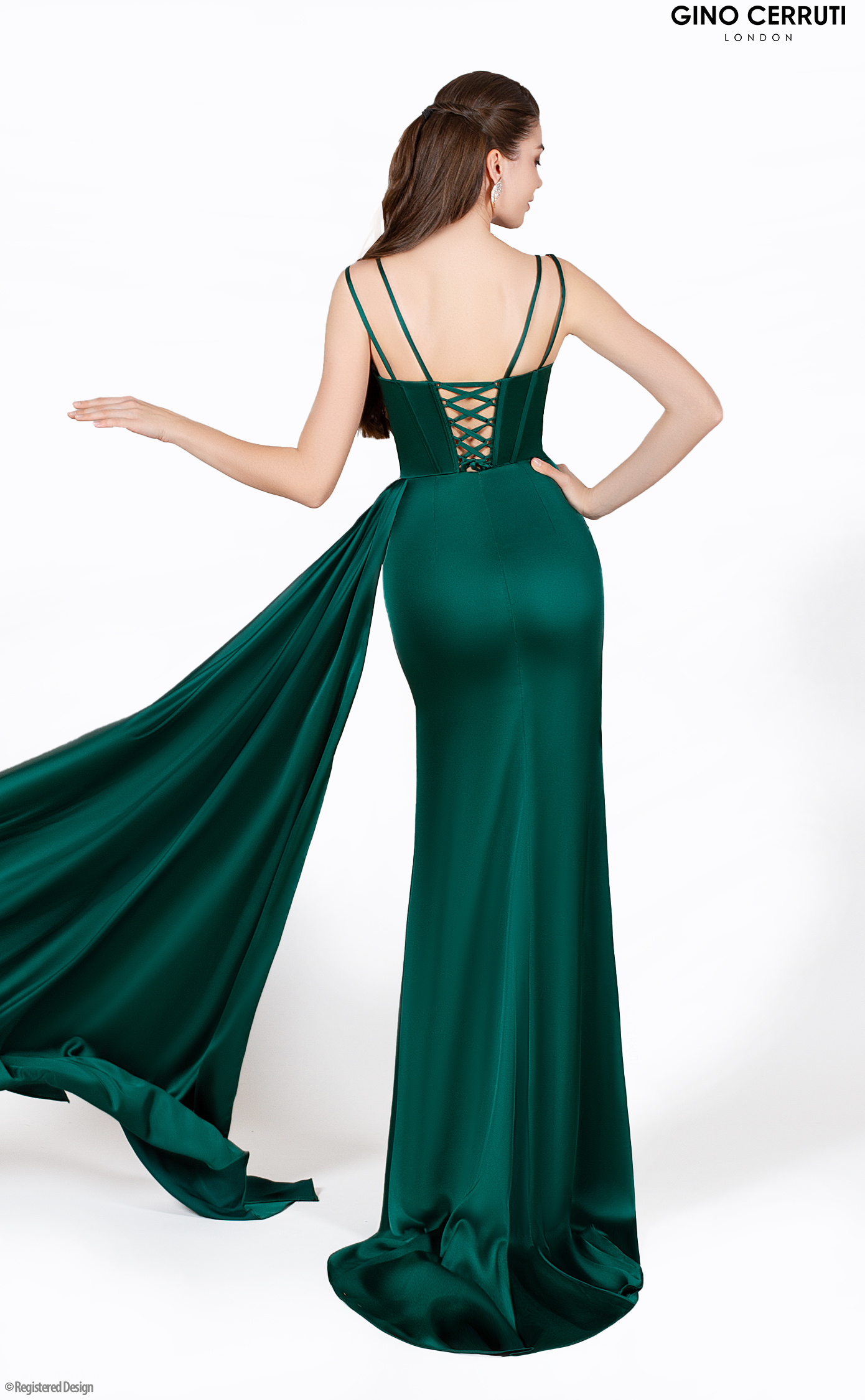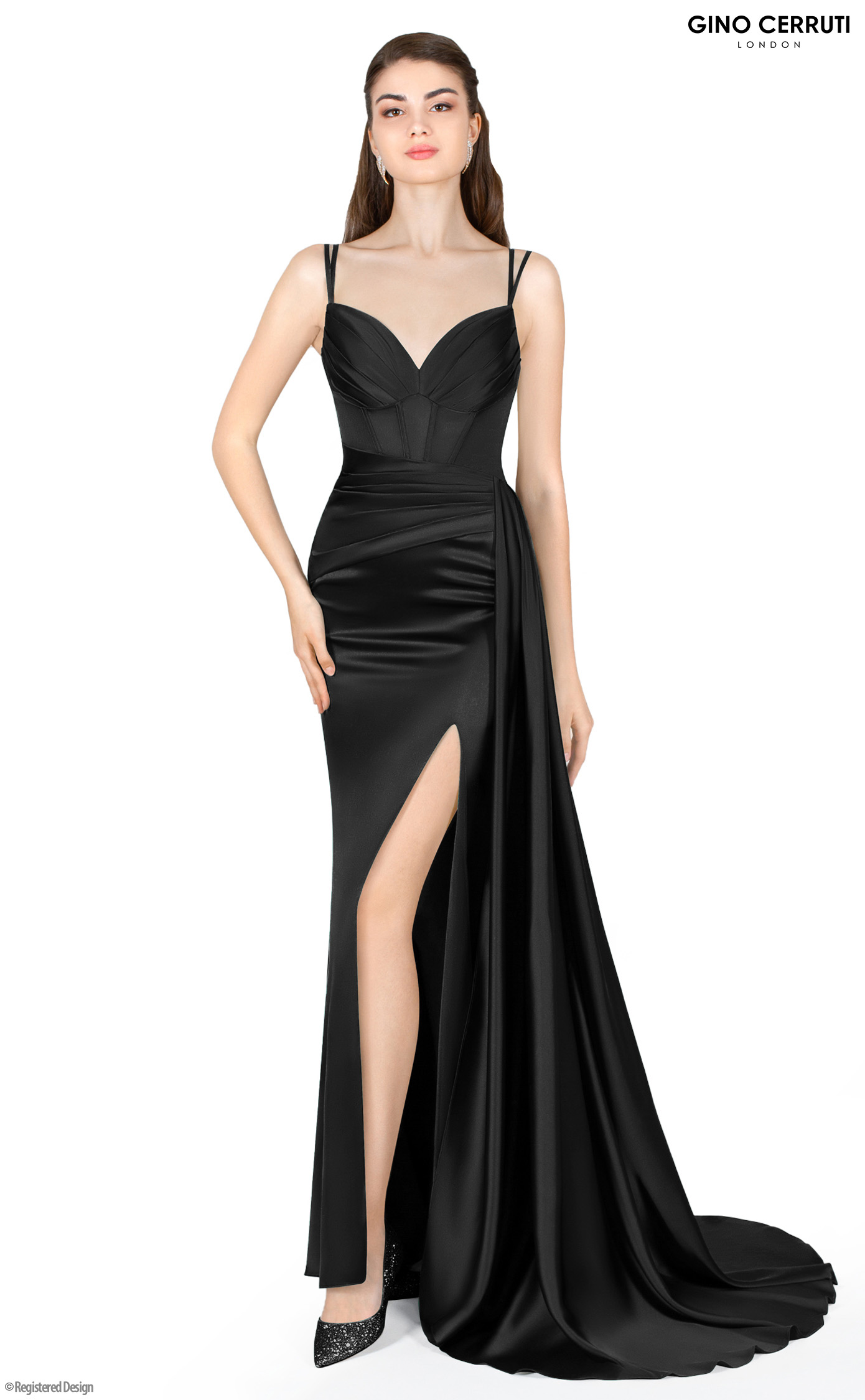 This captivating dress features corset lacing, a deep side slit, and double thin straps that create a stunning pattern on the back. With a deep V-neckline and pleated bodice cups, it also boasts a unique side draped detail from the waist. Dazzle wherever you go! * Double straps * Side drape * Small train * Leg split