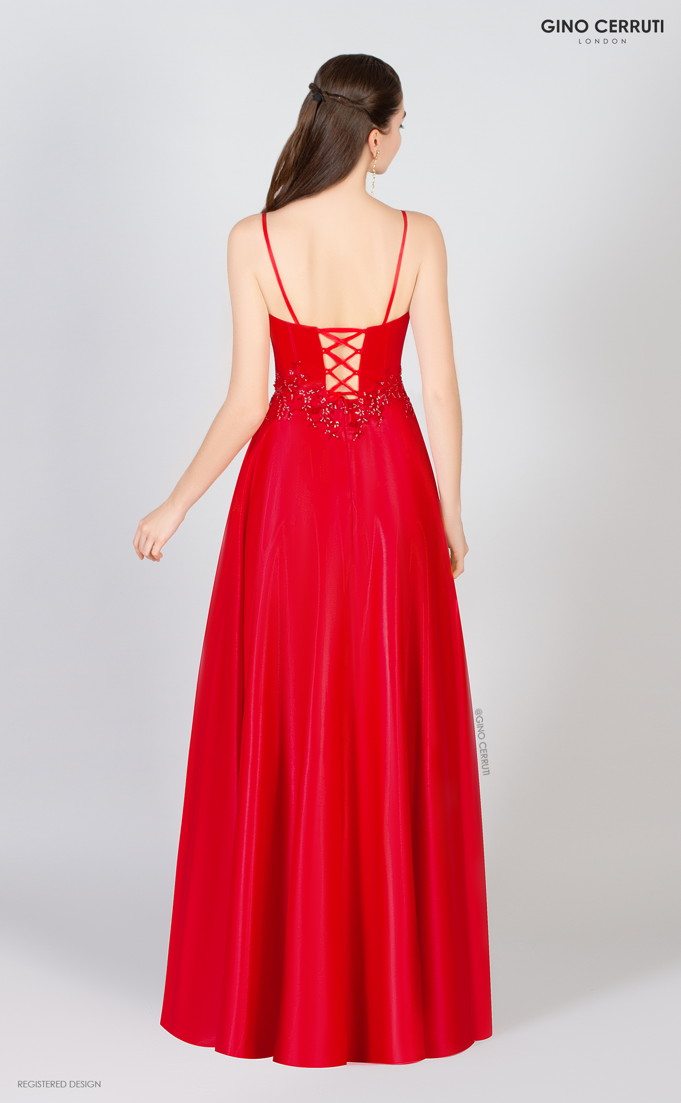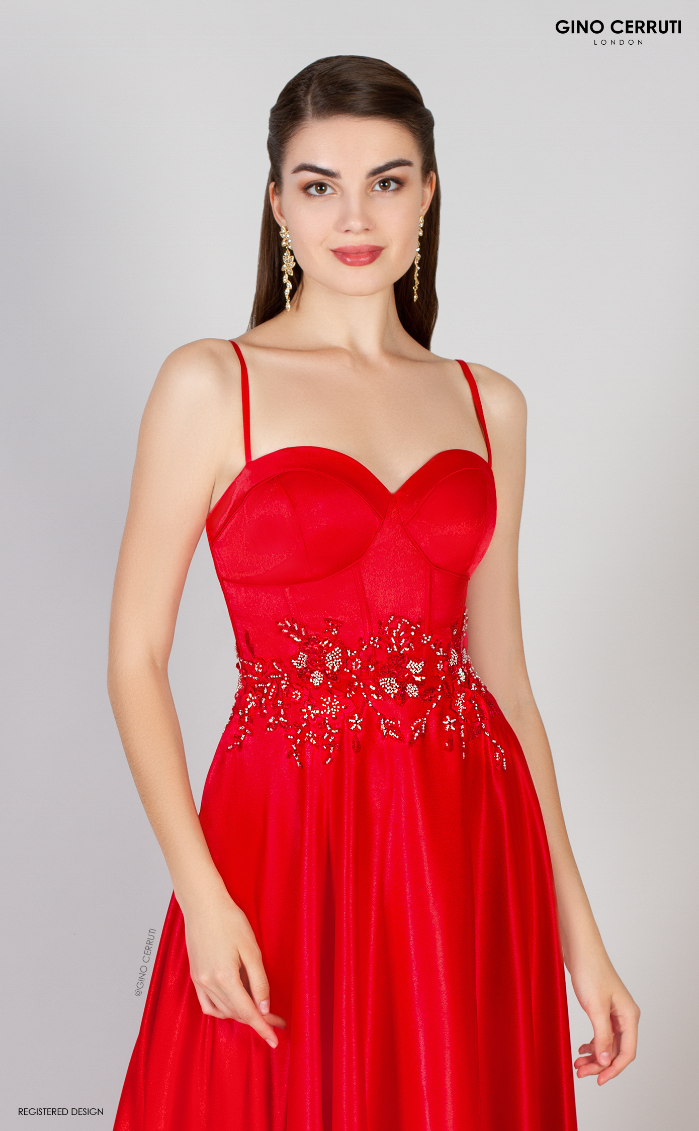 This elegant satin dress is a perfect addition to your special day! The beautiful beaded flower pattern at the waist adds a stunning decorative touch. With a sweetheart corset top featuring round cups and full back lacing, you'll feel sensational and confident. * Sweetheart neck * Corset top * Floral waist detailing * Leg slit
