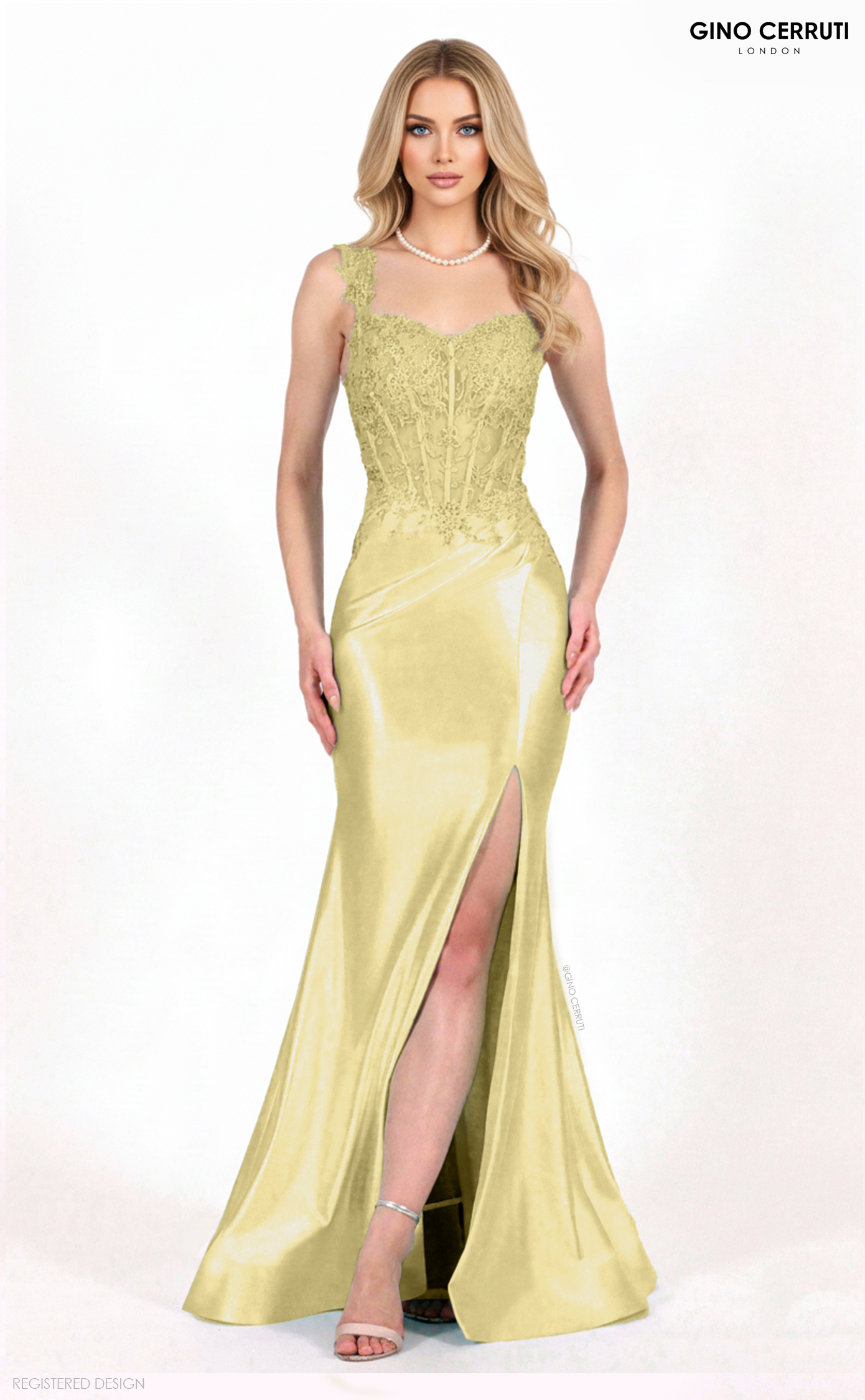 This stunning gown features a corset top adorned with intricate appliqué lace details. With matching straps and a gathered waist, the satin skirt showcases a daring leg slit. The horsehair hem and lace-up back complete this elegant look, perfect for any special occasion! * Corset top * Applique lace detail * Matching straps * Gathered waist * Satin skirt with slit * Lace up back