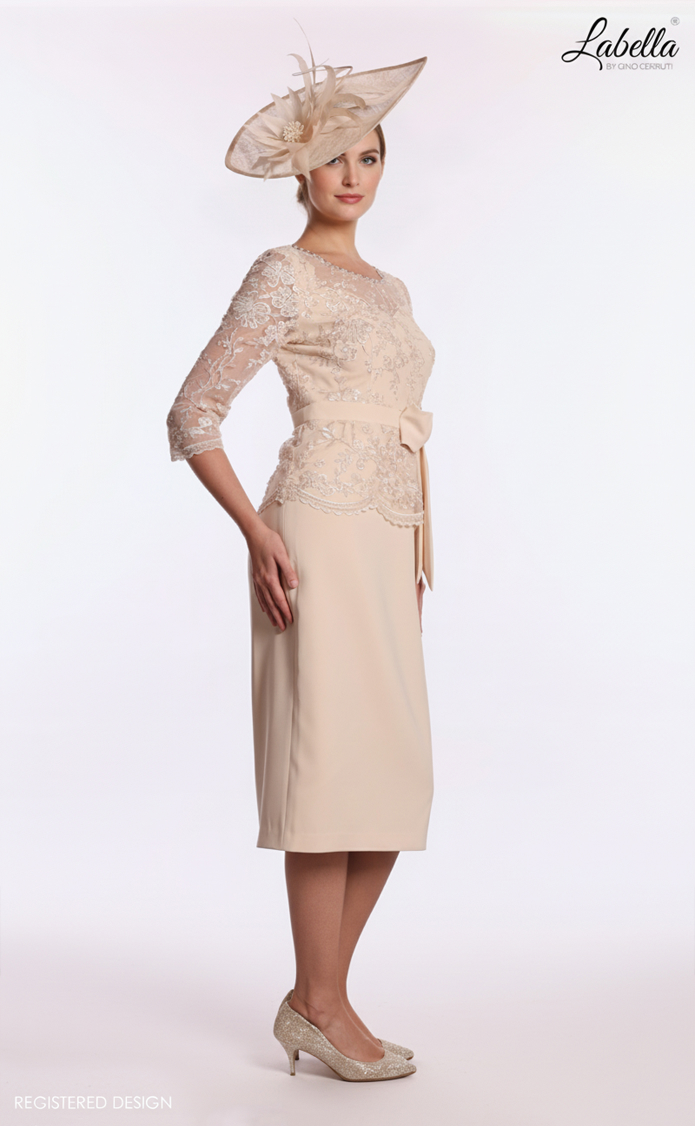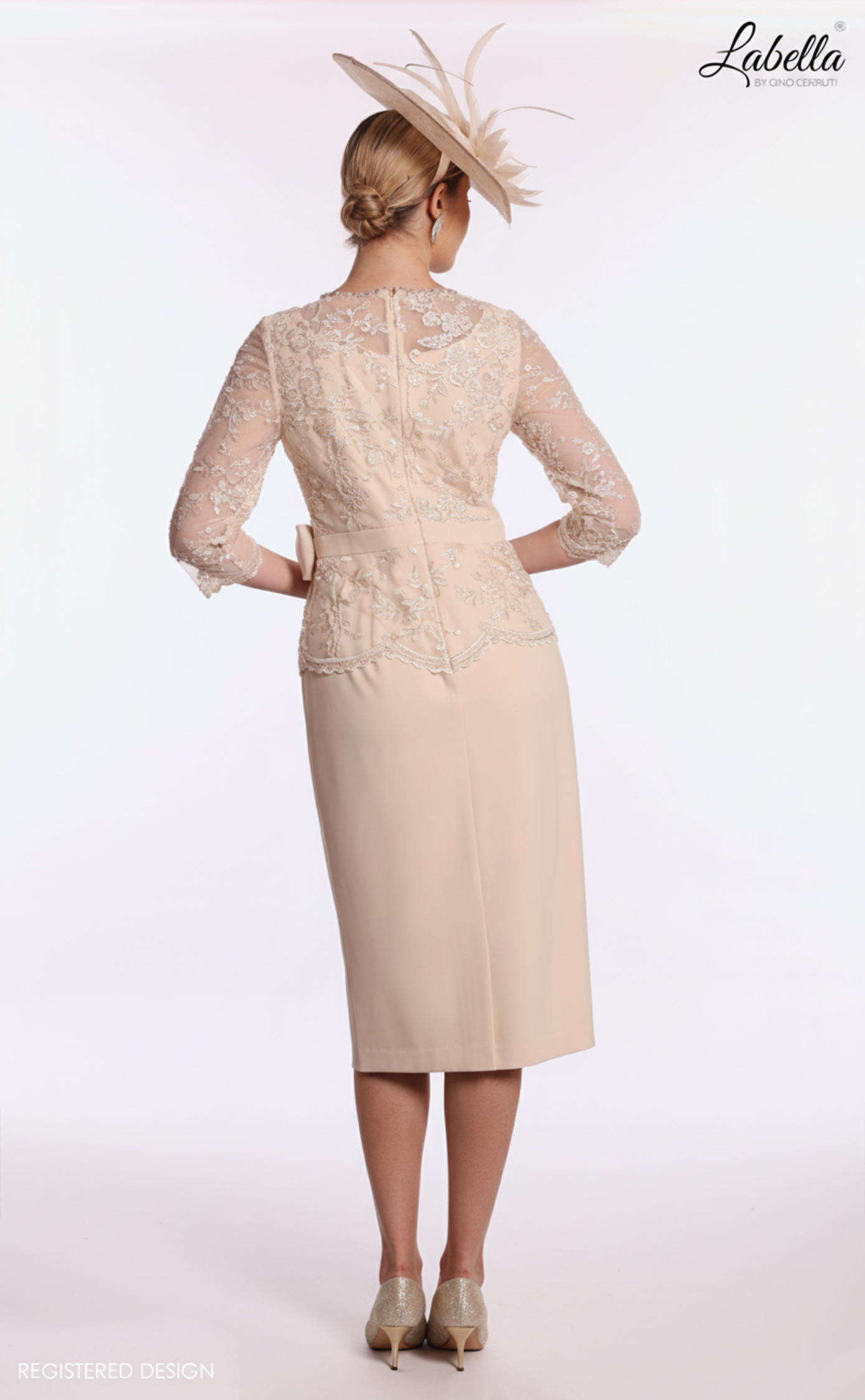 A bow is an essential attribute of a festive outfit, and when it’s adorned with beads, it becomes truly eye-catching! This tight-fitting dress is beautifully complemented by a lace top featuring delicate scalloped edges and a beaded neckline. * Illusion round neckline * Sweetheart silhouette * Belt with beaded bow * Lace sleeves * Knee-length