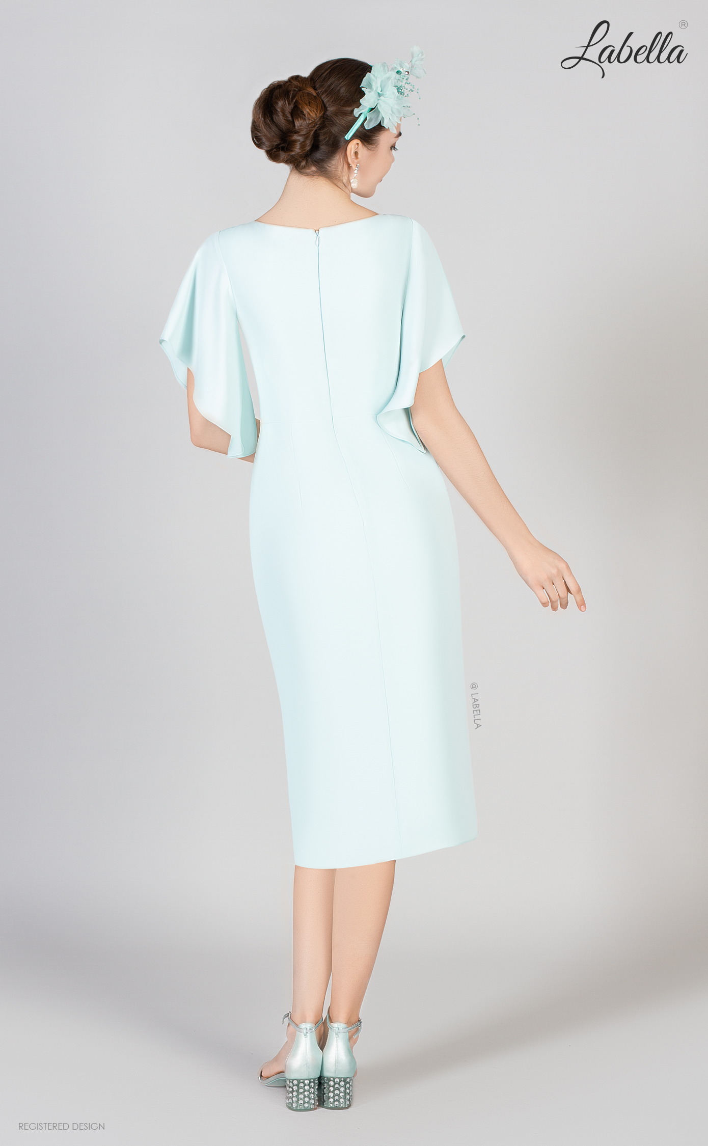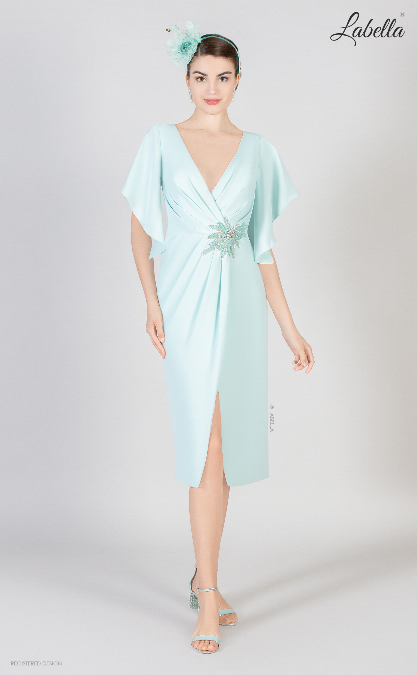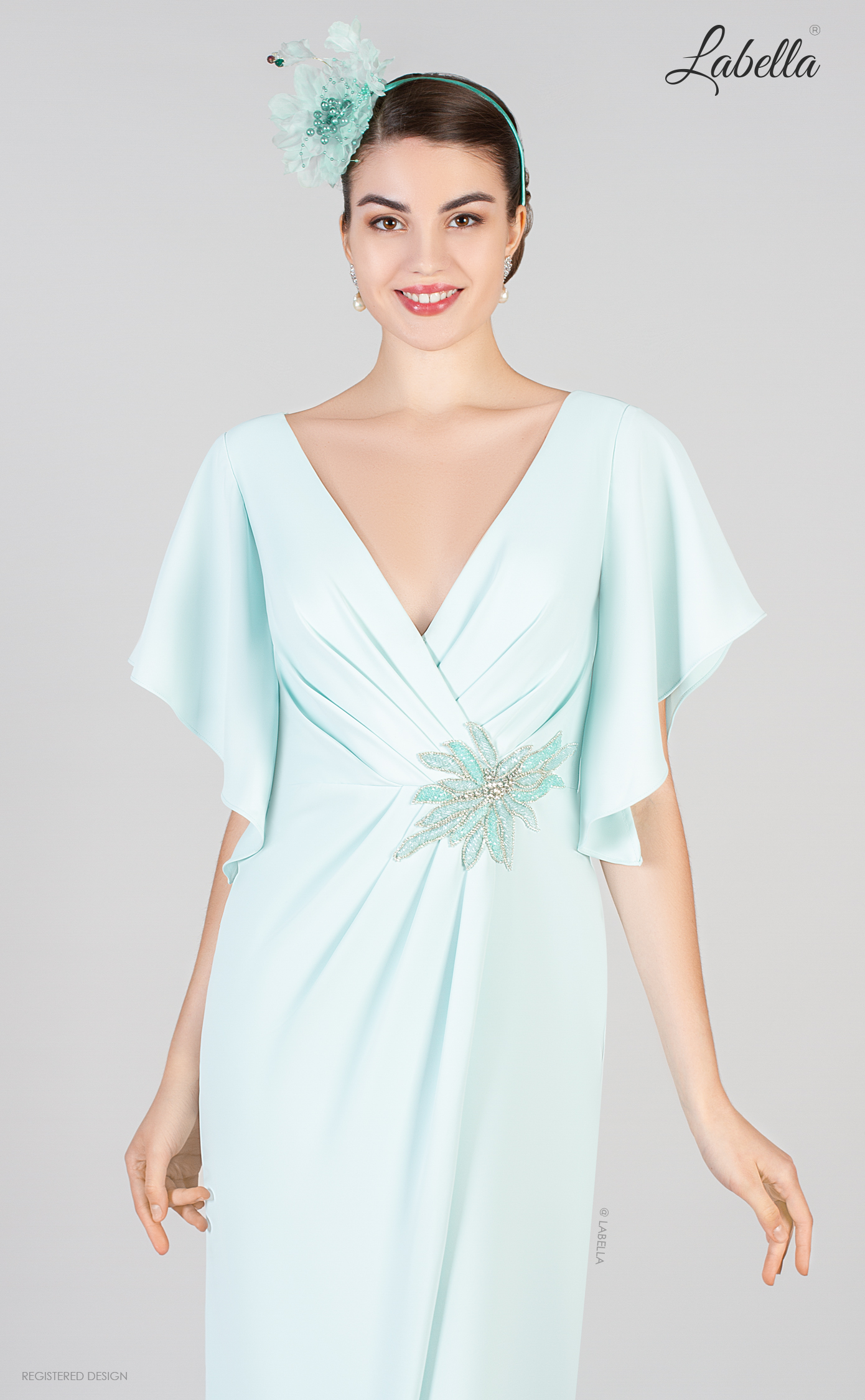 Sophisticated yet delicate. This feminine dress will complement your beauty, look at this beaded appliqué on the waist, it's an incredible shimmering flower. Flowing sleeves complement the deep neckline, and pleats at the waist show off the chic split in the skirt. * Beaded applique * Wavy sleeves * Deep cut * V neckline