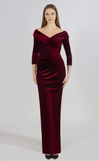 Ta oszałamiająca sukienka jest wykonana z eleganckiego weluru, z plisowaniem w całej długości, które podkreśla każdą sylwetkę. Szeroki dekolt w kształcie litery V pięknie eksponuje obojczyki, a 3/4 rękawy dodają nuty wyrafinowania. Ten fason to prawdziwe piękno owinięte w welur, idealne na wszelkie wyjątkowe okazje. * Ramiączka typu off-shoulder * Dekolt w kształcie litery V * Rękawy 3/4 * Plisowana góra * Podkreślona talia * Dopasowana sylwetka
