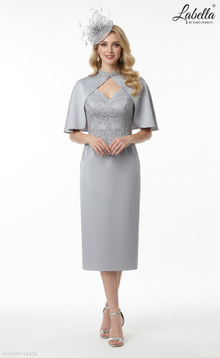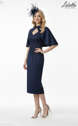 To sukienka w eleganckim stylu z peleryną o błyszczących koralikach na kołnierzu Nehru. Sukienka ma wyrafinowany dekolt w kształcie litery V, pokryty szczegółową koronką. W talii znajduje się dekoracyjny pasek z koralikami. * Dopasowana sylwetka * Peleryna * Kołnierz Nehru z koralikami * Koronkowe detale * Długość do kolan