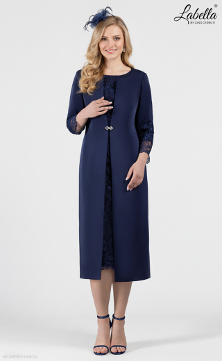 Ta pięknie haftowana koronkowa sukienka ma rękawy typu Cap i jest zestawiona z dopasowaną kurtką z wysmuklającym talię paskiem. Kurtka ma rękawy o długości 3/4 wykończone przezroczystym koronkowym obszyciem oraz eleganckim zapięciem z broszką, co sprawia, że całość jest niezwykle elegancka na każdą okazję. * Okrągły dekolt * Przezroczysta koronka * Rękawy typu Cap * Pasująca kurtka z małym zapięciem na broszkę * Dopasowany krój