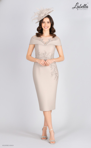 Ta wspaniała sukienka do kolan wyróżnia się iluzorycznym dekoltem ozdobionym piękną aplikacją, co zapewnia efektowny look odsłaniający ramiona. Perfekcyjnie dopasowana, zawiera delikatny koralikowy pasek, co czyni ją idealnym wyborem dla eleganckich matek panny młodej lub pana młodego. * Iluzoryczny dekolt * Detal z aplikacją * Długość do kolan * Dopasowana sylwetka