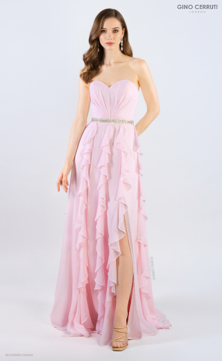 Ta delikatna sukienka na bal charakteryzuje się bezrękawowym dekoltem w kształcie serca oraz plisowanym gorsem, który pięknie podkreśla sylwetkę. Spódnica ma stylowy detal w postaci falbany wodospadu oraz rozcięcie na nodze, a talia jest podkreślona zachwycającym paskiem z cekinami. * Bez ramiączek * Plisowany gorset * Beading w talii * Spódnica z falbaną wodospadu * Rozcięcie na nodze * Zapięcie na plecach z panelą skromności